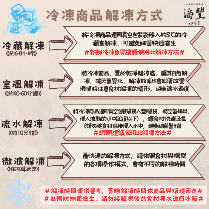 解凍方式:自來水沖退冰(隔水沖退冰)