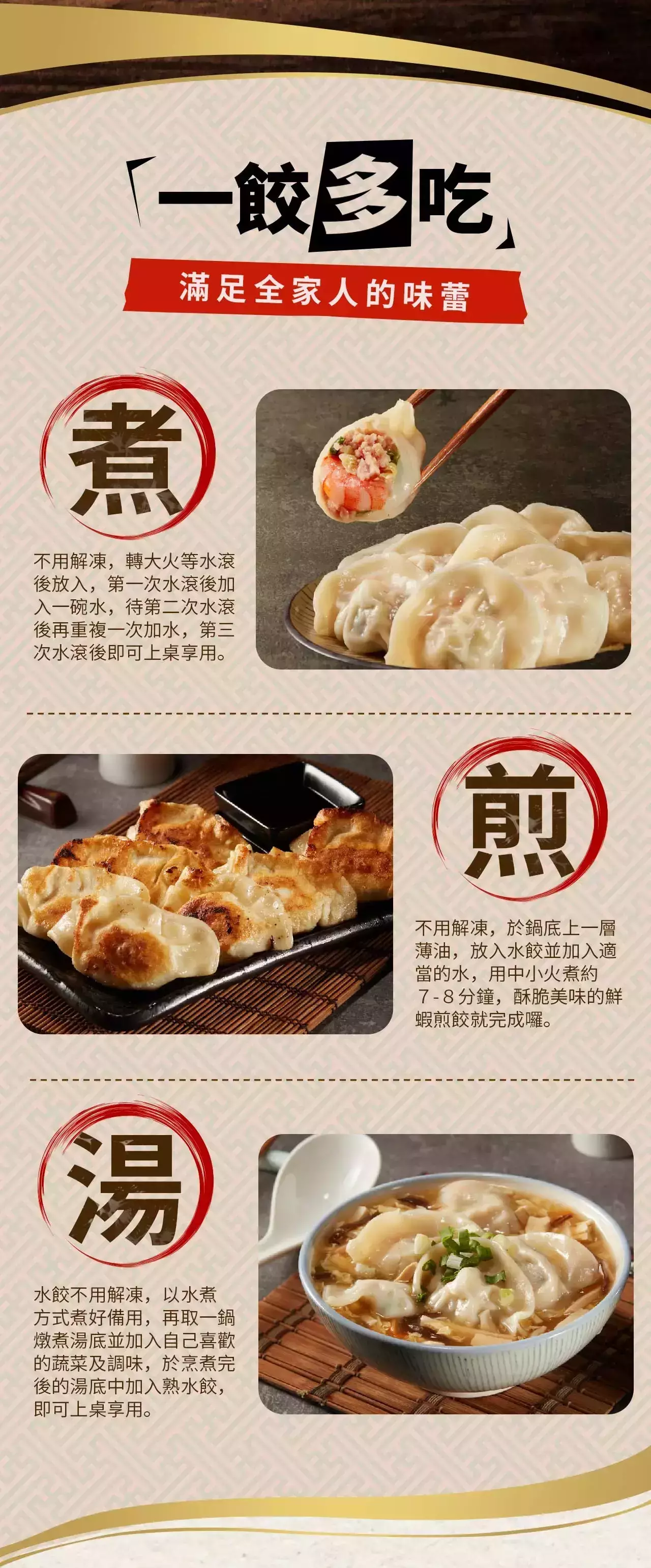 搭配台灣溫體豬與薄透餃皮,一顆水餃包入一尾蝦仁,每一口都是剛剛好的黃金比例,是每個家庭冰箱的必備食材👍