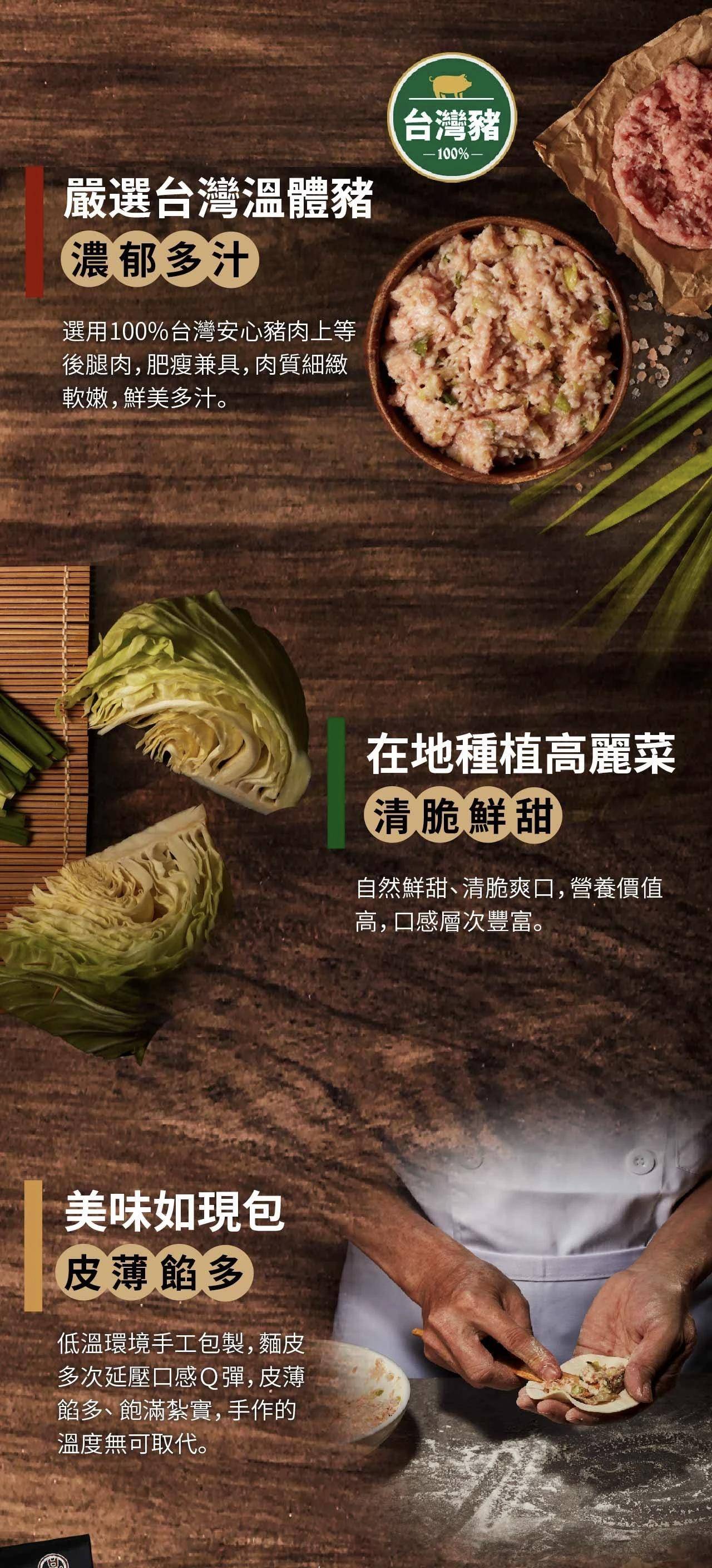 產品成分:小麥麵粉、高麗菜、水、白蝦仁、豬肉(台灣)、豬油(台灣)、韭菜、蔥、芝麻油、姜、L-麩酸鈉、鹽、糖、蝦皮、白胡椒粉